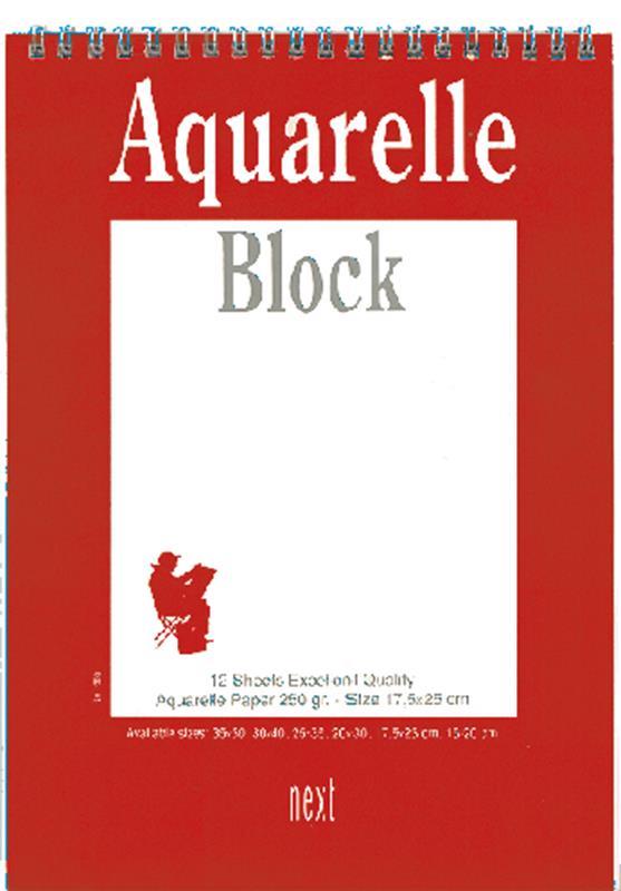 Next μπλοκ ακουαρέλας επαγγελματικό. Με διπλό σπιράλ. 12 εσωτερικά φύλλα. Χαρτί ακουαρέλας 250γρ. Για ζωγράφους και σπουδαστές σχολών ζωγραφικής. Δαστάσεις: 35×50εκ.